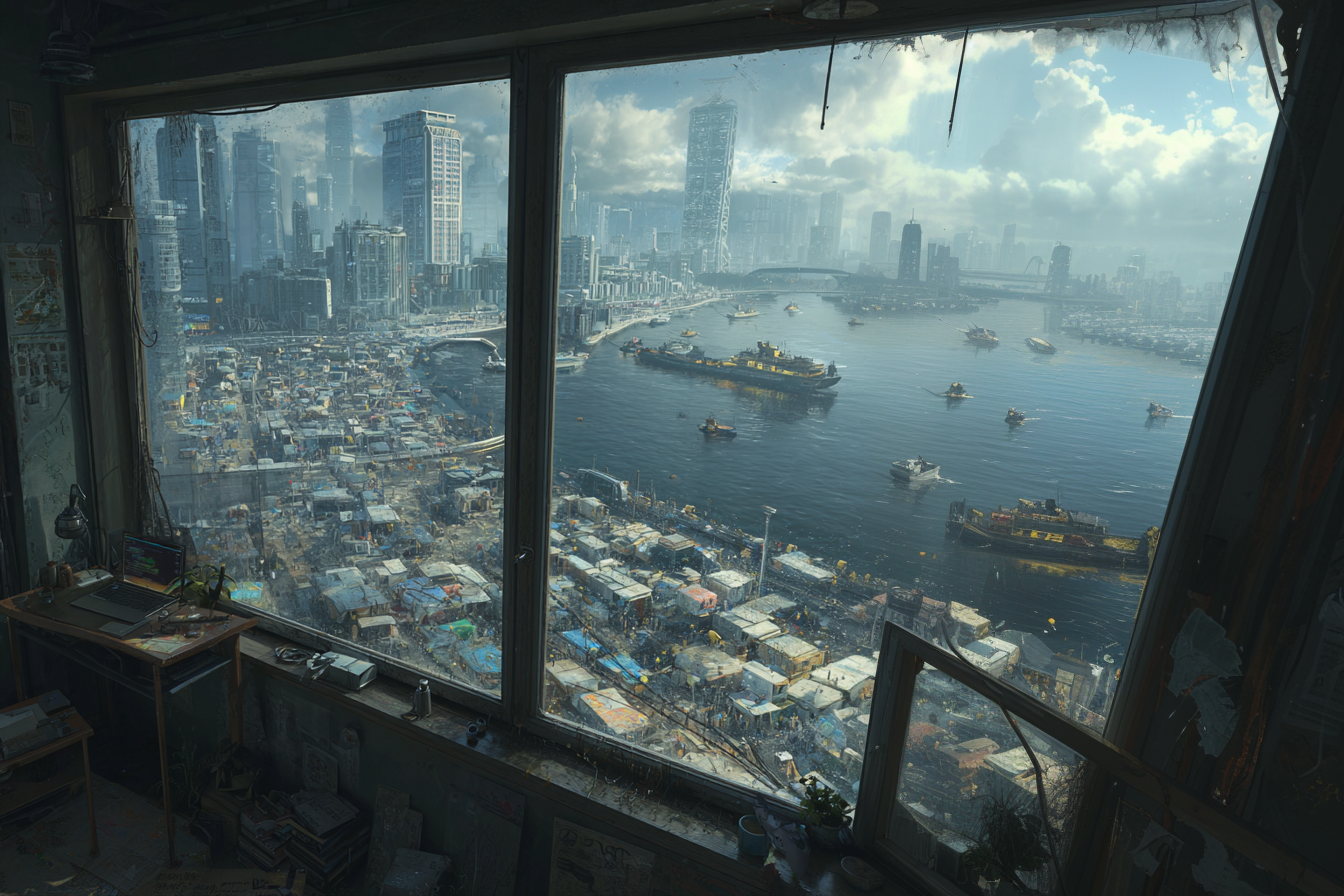 The street down below her window wasn’t a street anymore — more like a scar. Asphalt shredded years ago, replaced by patches of pitted concrete, sinkholes, and printed slabs misaligned and already cracking. The rain hadn’t cleaned it, just moved the grime around. The air carried a wet, metallic stench — copper and old plastic, burned insulation and algae bloom.