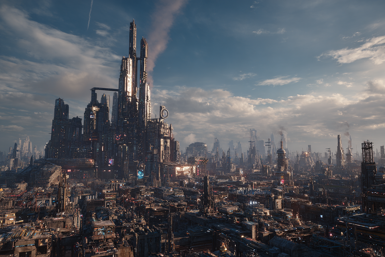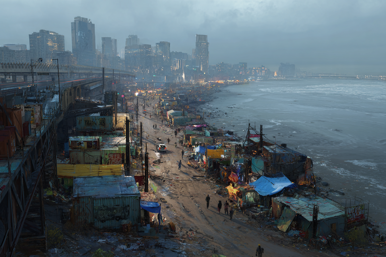 Higher up, along the skeleton frames of the towers, were the hive-stations — micro-squats welded into the girders, ten, twenty floors up. You could barely see the people living up there — shadowy figures moving through catwalks and tarp flaps — their homes lashed to the beams with scavenged cable and spider-silk printouts, sagging precariously with every gust.