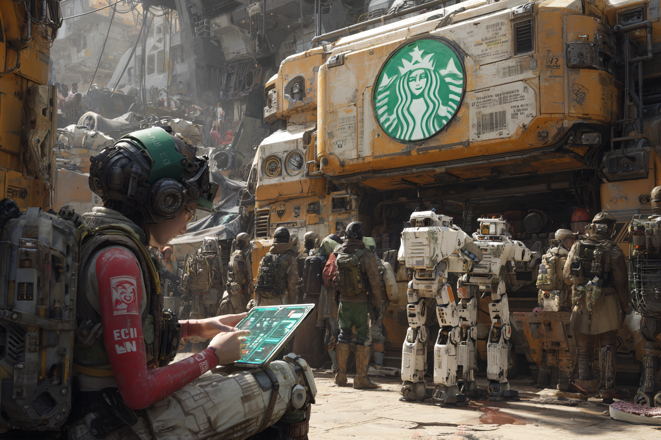 She could almost hear the smirk behind it — the simulated encouragement of an algorithm pretending to be a friendly professor, or a guidance counselor, or maybe just a very patient ghost. She sat back, feeling the crate creak under her, and looked up. The old Starbucks hulked over the square like a fossilized whale carcass. Around it, the line shuffled — workers, soldiers, scavengers, bots — waiting for rations, for sermons, for another day to not fall apart. She watched a bot grind past, its joints squealing, rust bleeding through the polymer shell. One of its visual sensors was taped over with a smiley face sticker.
