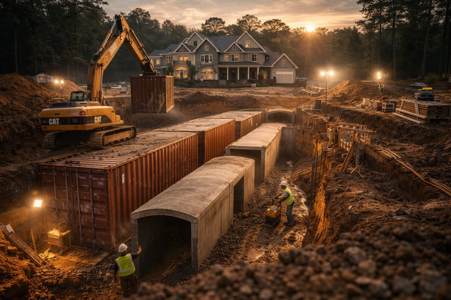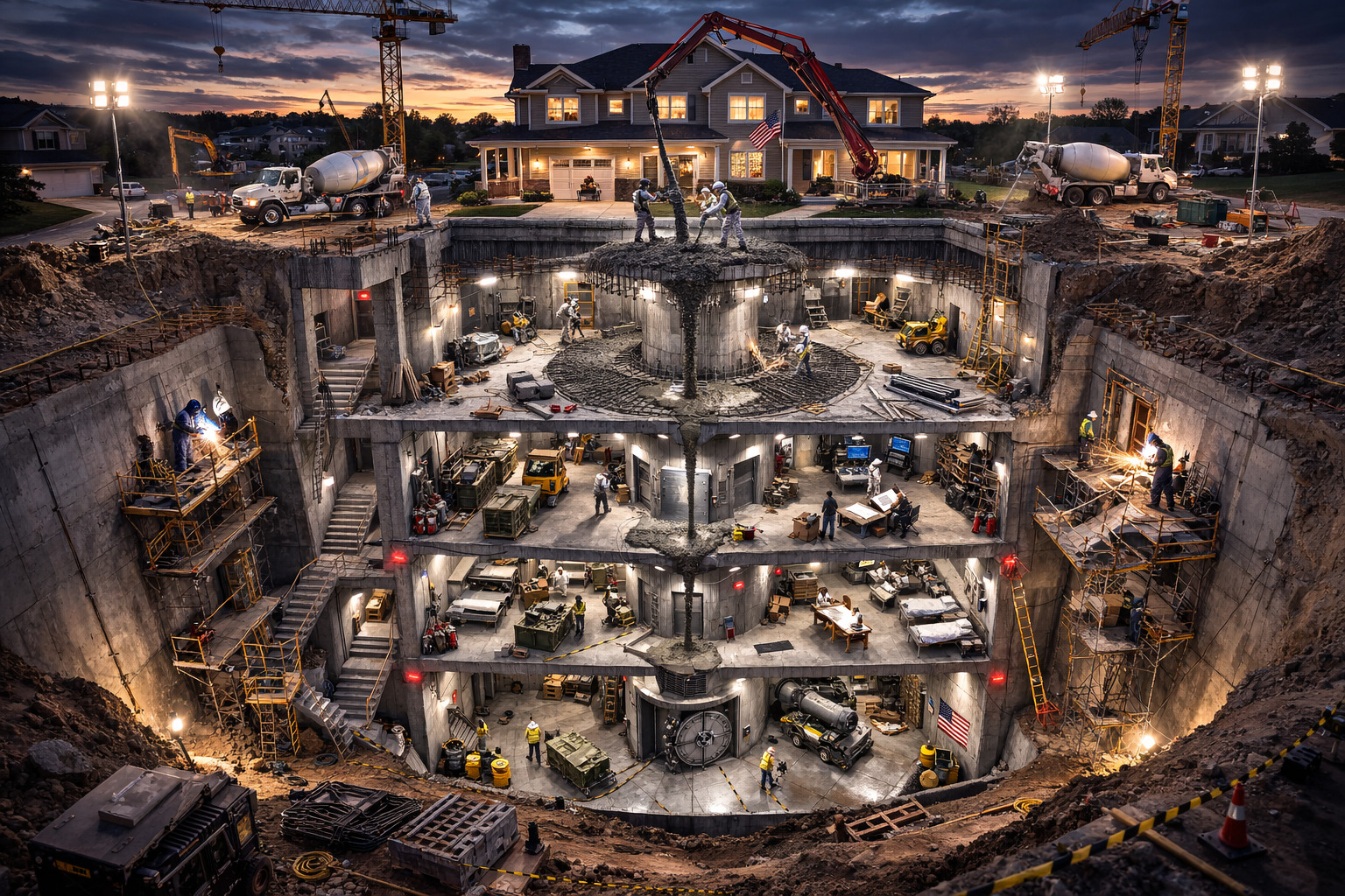 It was, even by the inflated standards of mid-2000s preparedness culture, a spectacle. The reinforced modules arrived on flatbeds like components of a lunar base, matte black and ribbed with structural geometry that suggested seriousness rather than improvisation, and when they were craned into the excavation two layers deep in a precise 2×2 grid, the scale of the thing forced even skeptical neighbors into silence. Floodlights carved the night into bright planes of activity and shadow, and the staircase that cut between the stacked levels, bolted in place before backfill, gave the structure an architectural legitimacy that his earlier experiments had lacked. This was not a buried container anymore; it was a subterranean facility. When Evelyn stood at the edge of the pit with her 2006 digital camera, the glow from the construction lights catching in her hair, she did not appear alarmed or embarrassed but animated, as if documenting the launch of a second enterprise, and her pride lent the scene a kind of domestic endorsement that neutralized its extremity.