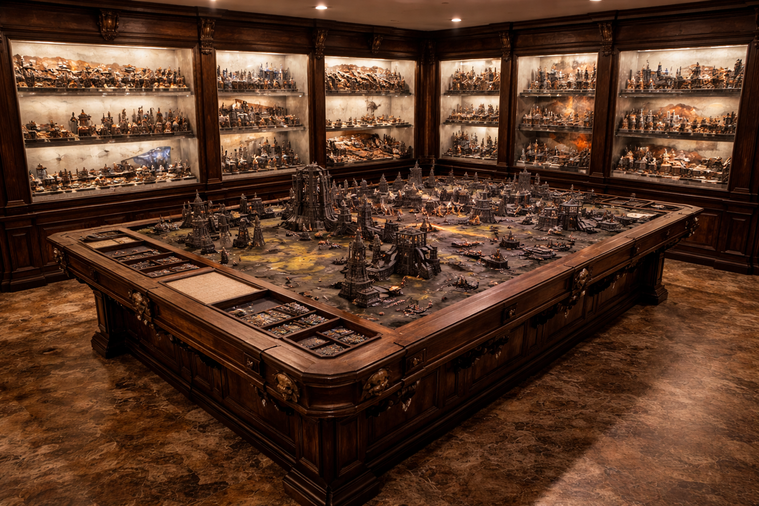 The Warhammer room was, for twelve radiant months, the crown jewel of the subterranean complex. If the D&D table had been craftsmanship, the Warhammer installation was imperial mania carved into hardwood and resin. The table alone was the size of a small studio apartment, a cathedral of oak and brass with inlaid measurement grids, hidden drawers for dice and templates, and a recessed battlefield surface that could be swapped between ash wastes, gothic hive city, and blasted tundra. He had commissioned it from a custom shop three states away, specifying reinforced legs “just in case” and integrated LED lighting that could simulate dawn bombardment or orbital strike glow. The craftsmanship was so excessive that it bordered on parody; carved aquilas, iron skull motifs, even brass corner guards that looked as if they belonged on a treasure chest dragged from a crusade.