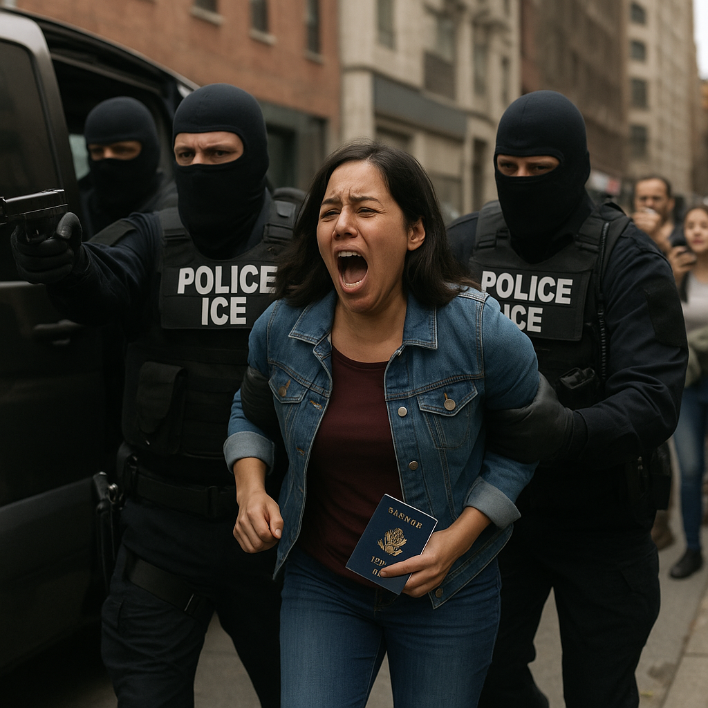 A U.S. citizen woman is seized by masked, unidentified ICE agents in public. She is stripped of her citizenship via Kafkaesque technicality and subjected to physical and psychological abuse while detained. Bystanders film the incident and express alarm. ICE agents respond by drawing weapons and threatening the crowd. The woman is handled roughly.
