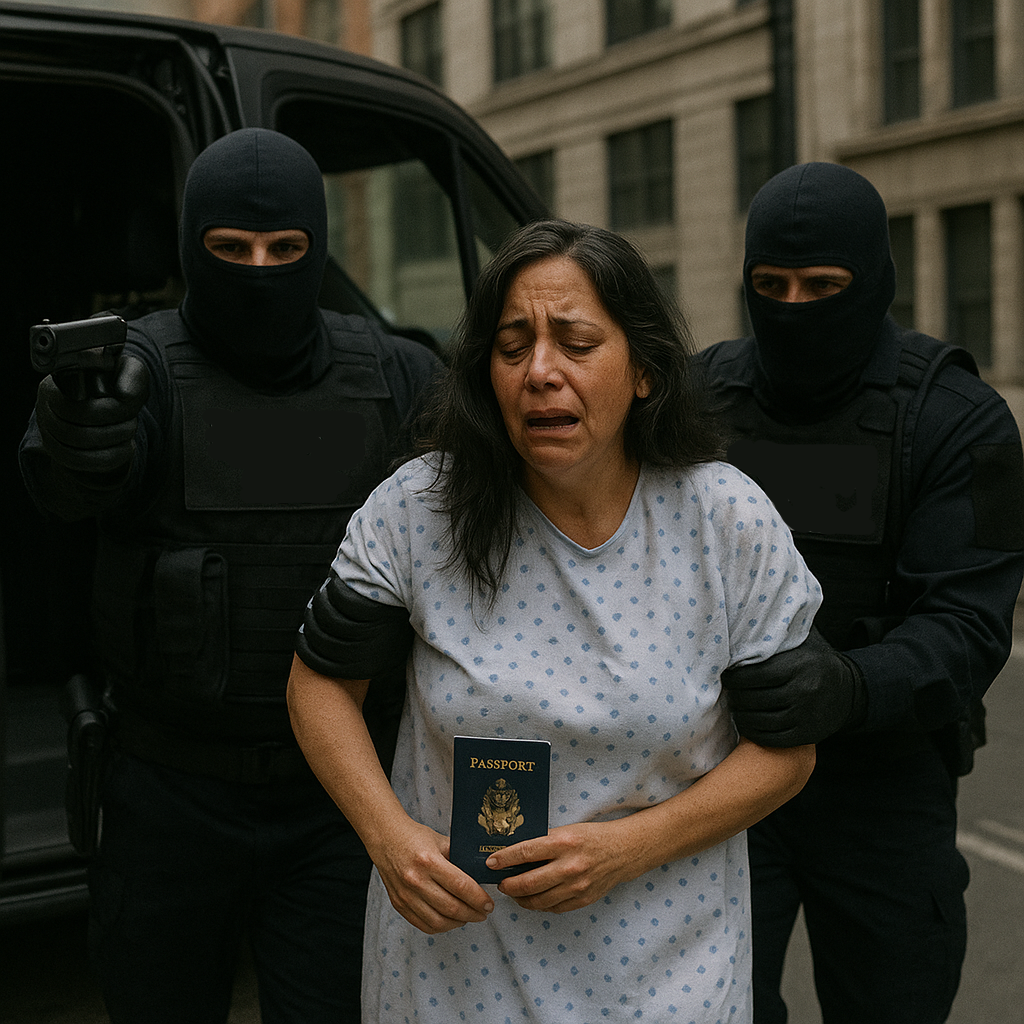 A U.S. citizen woman is seized by masked ICE agents who fail to identify themselves. She’s stripped of her nationality through obscure legal reinterpretation. She has cancer, but while detained, is denied treatment and begins to deteriorate. Deportation is pending. Bystanders recorded the initial seizure but no legal response is forthcoming.