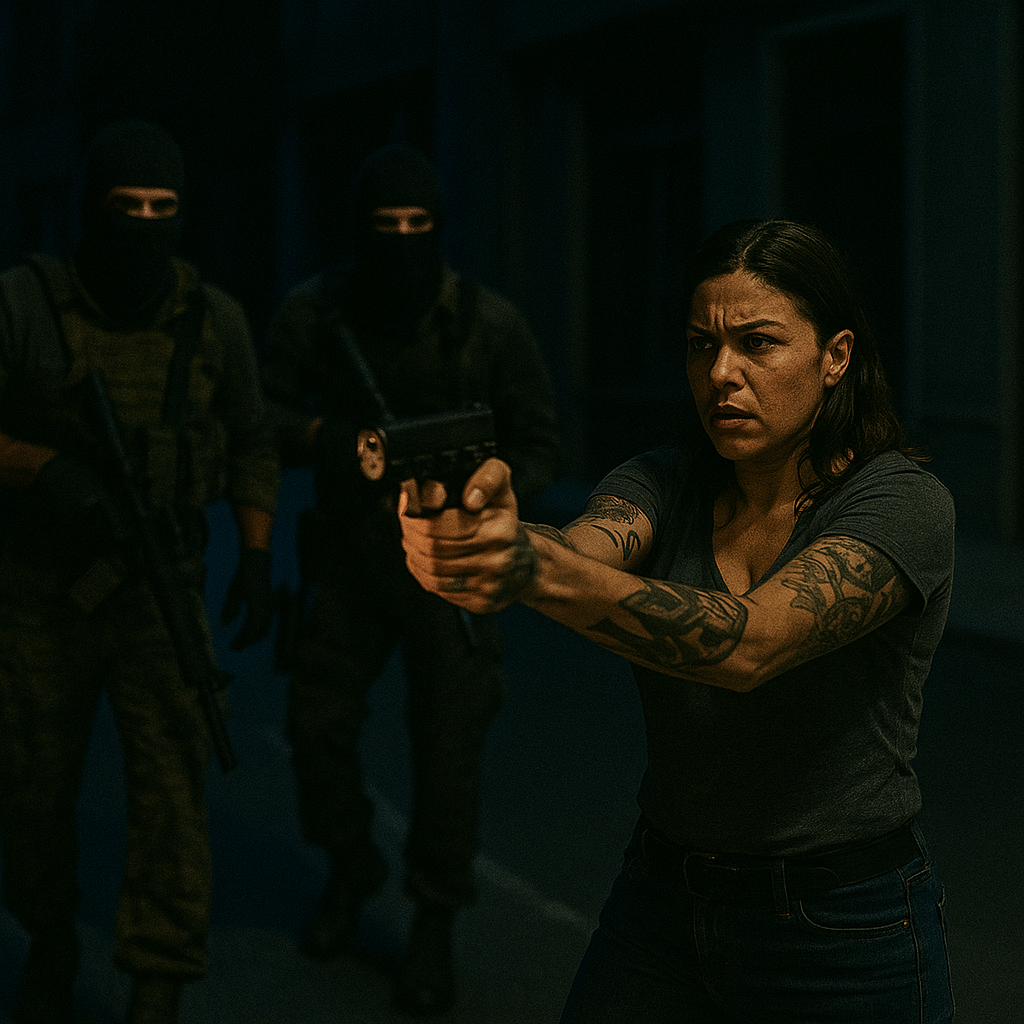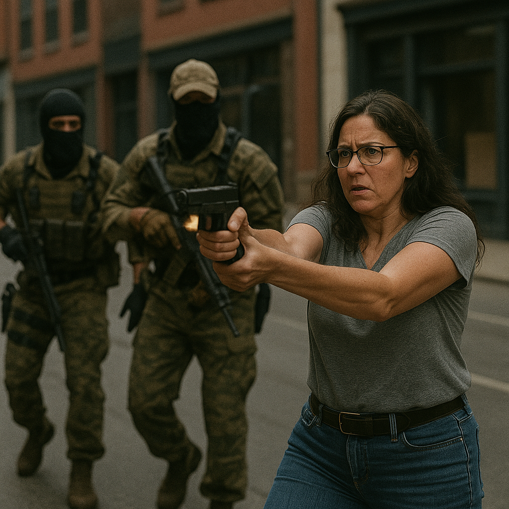 A U.S. citizen woman — fully assimilated, apolitical, armed (legally), and legally protected under Stand Your Ground laws — is approached by masked men attempting to seize her. Fearing a kidnapping, she draws her firearm and kills three ICE agents who failed to identify themselves. The event is filmed. She has no activist background, but is of immigrant descent.
