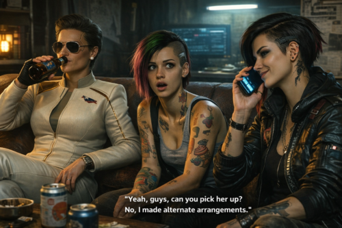 She should be wide-eyed, not screaming. Too shocked for volume. The silence around her is part of the joke. Judy has seen Night City, seen braindance horrors, seen gang madness, seen corporate rot—but this is different. This is surreal not because it is violent, but because it is administratively impossible. Myers, meanwhile, is on the couch drinking a beer like someone who has passed beyond dignity and reached a higher, grimmer stratum of composure. Not sloppy, not slouched, not comedic. She drinks like a person who understands that history has gone off-book and there is no point pretending otherwise. In some perverse way, she respects the efficiency of what V has done. Not emotionally. Not warmly. But professionally. V is on the phone, and that phone call is the axis of the whole composition. She is not pleading. She is not apologizing. She is not explaining. She is informing.