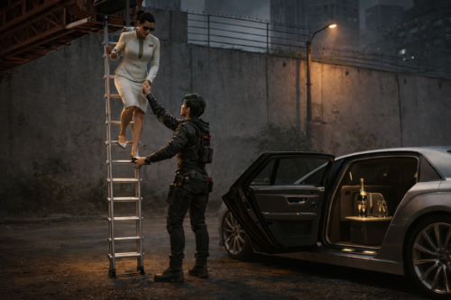 The basket hangs just over the lip of the wall. Myers is climbing down—carefully, not helplessly. She is not being carried like a damsel. That would weaken her. She is controlled, steady, pissed off, adaptive. A President stripped down to first principles: survive, descend, continue. She is dressed for the aftermath of disaster, not ceremony. Wind catches on her clothing. The wall behind her is scarred, massive, and suddenly stupid. V is below, one hand up, guiding her the last step down. Not reverent. Not flustered. Efficient. The gesture is intimate only in the sense that all true emergencies are intimate: weight transfer, balance, grip, no speeches. V is not basking. V is managing. And then—right there, absurdly, gloriously, perfectly—there is the Delamain. Waiting. Door already open. Paint immaculate. Body flawless. Glass dark and expensive. That rich, overcompetent machine-calm presence. It should look like it has no business being in this muddy, busted seam outside Dogtown, which is exactly why it’s funny. Somebody—V, or V through some favor, or V through sheer Night City black magic—has arranged a perfect extraction vehicle at the base of a geopolitical wound. This is where the image becomes lethal. Because if the viewer sees all of this at once— the wall – the boom – the President descending – V helping – the car ready – the route out already secured – then the whole natural response is: What. Exactly. Is the fucking problem.