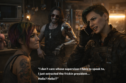 The room should be richly lived-in. Not filthy caricature, not fan-service clutter, but real Judy-space: tech residue, soft practical lighting, hints of color, cables, screens, apartment intimacy. The whole point is contrast. Night City domesticity contains what the state could not. The President is safe not because of a fortified black site, but because nobody in the grand chain of command would imagine this as the holding pattern. That is why the image is so vicious. It says: Your institutions are stupid in exactly the ways ordinary people survive around. Judy’s stare should be aimed not just at Myers, but partly at V—as if she is trying to decide whether V is a genius, a lunatic, or some special hybrid native to Watson. Myers sits with contained steel, still visually presidential even in a living room. V, relaxed enough to make the phone call, becomes the only person in the frame who has fully metabolized what just happened. She has crossed the threshold from “participant in crisis” to “owner of outcomes.” That’s why phase two is the crown jewel. It miniaturizes the empire.
