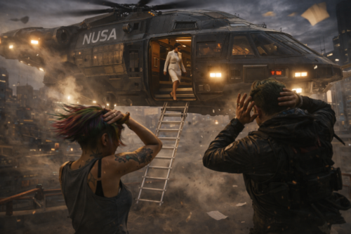 It should be played dead seriously, with the kind of visual conviction that makes the joke hit harder. The funnier it is conceptually, the more sincerely it should be framed. Big cinema. Hard light. Wet metal. Calm faces. Bureaucratic obscenity. The President of the NUSA being treated not like a goddess of the republic, but like a high-value parcel V has already signed for and rerouted. This is a story about an empire discovering, to its horror, that one merc with initiative and terrible manners can outperform its entire ritual apparatus.