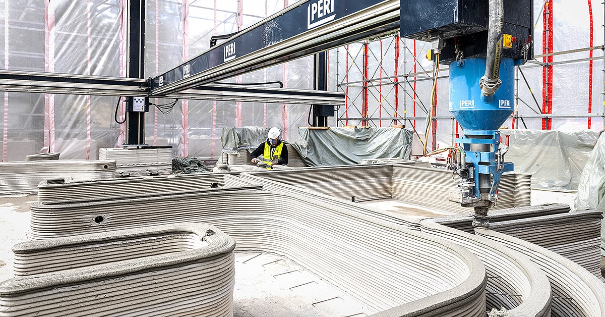 The tracked robot platform positions itself. Its arms extend, and what emerges is not a shovel but something that looks like a massive 3D printer nozzle. It begins depositing concrete in careful, geometrically perfect lines. Not pouring—depositing. Layer by layer, a foundation emerges from the printed concrete mix, darker than normal cement, almost black, with a matte finish that seems to absorb light.