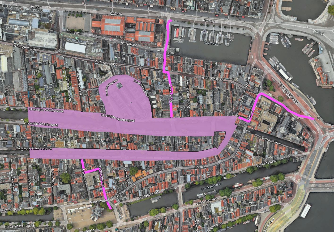Op de hoek Damrak en de beurs van berlage komt een trap en ligt met een tweede ingang naar een ondergrondse ingang. Deze loopt ondergronds naar de Oudebrugsteeg, onder de Warmoestraat naar de Enge Kerksteeg en komt uit op het oudekerksplein.