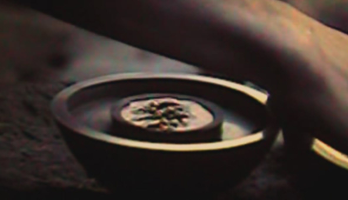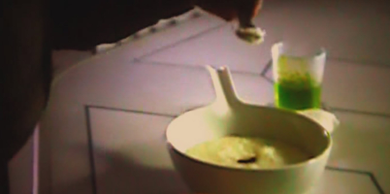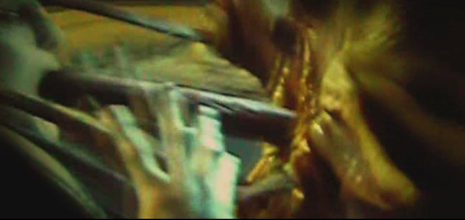 The engineer then lifts the chalice and as we can see while it is lifted the animate material inside has flowed around the cup and is transforming in nature into something partially fluid or worm-like. It looks to me as if the substance is dangerous. Yet the Engineer is deliberate in his motions and lifts the cup to his mouth.