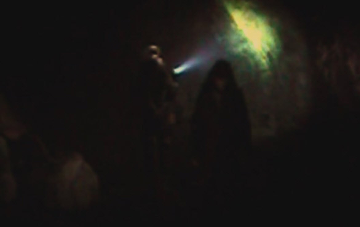 Human hands are opening a sandy hole, holding a recognizable flash light. This scene affirms that there are still humans in the year 2080 living in a culturally recognizable Earth. People were fairly recognizable clothes and use fairly recognizable tools.
