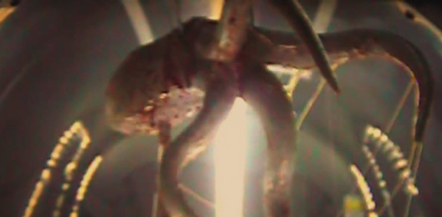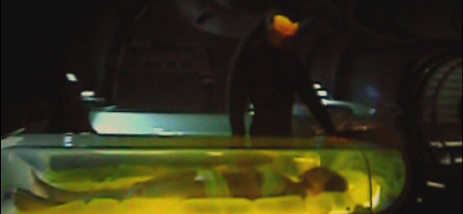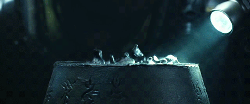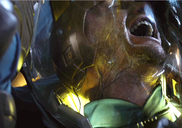 Mostly dis-robed, the engineer then lifts the object (urn, container, vessel, vase, jar) he laid down, with a very deliberate and grave intent. The music accompanying the scene also suggests gravity and ancient importance of this event. The Engineer then removes what appears the top of the container, and inside is an animate ooze of some sort. Upon opening the lid there is a very subtle (hiss) suggesting the container was sealed, and after opening the material inside seems to respond to the open environment, as if “getting ready” for something. The suggestion is the material inside is an infectant of sorts.