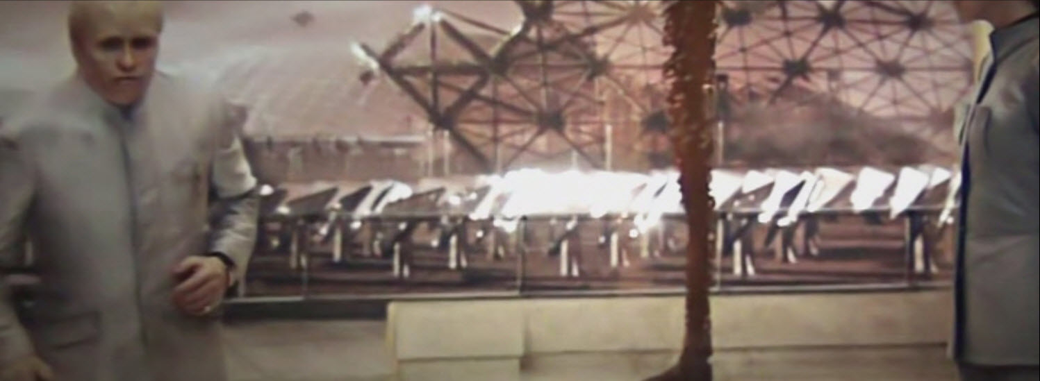 A lengthy shot of Earth, ten thousands of years before civilization. The landscape is empty and savage. There are no signs of humanity anywhere. The scene depicts the virgin earth, and especially a region with very little forestation. The scene then culminates over a waterfall. Over the waterfall serenely floats a round shape suggestive of being a flying saucer.