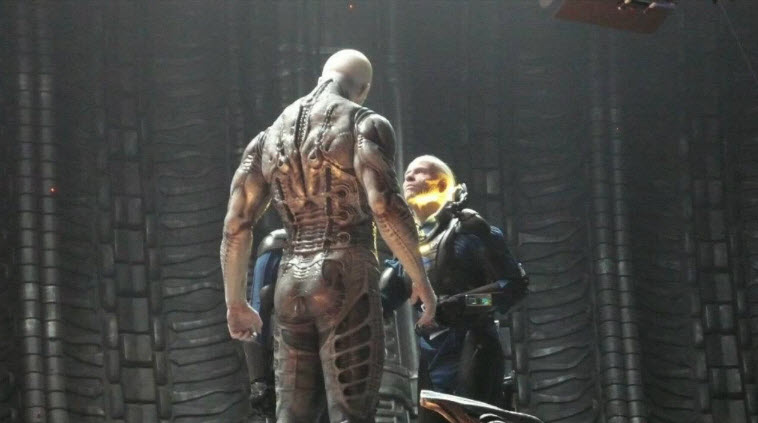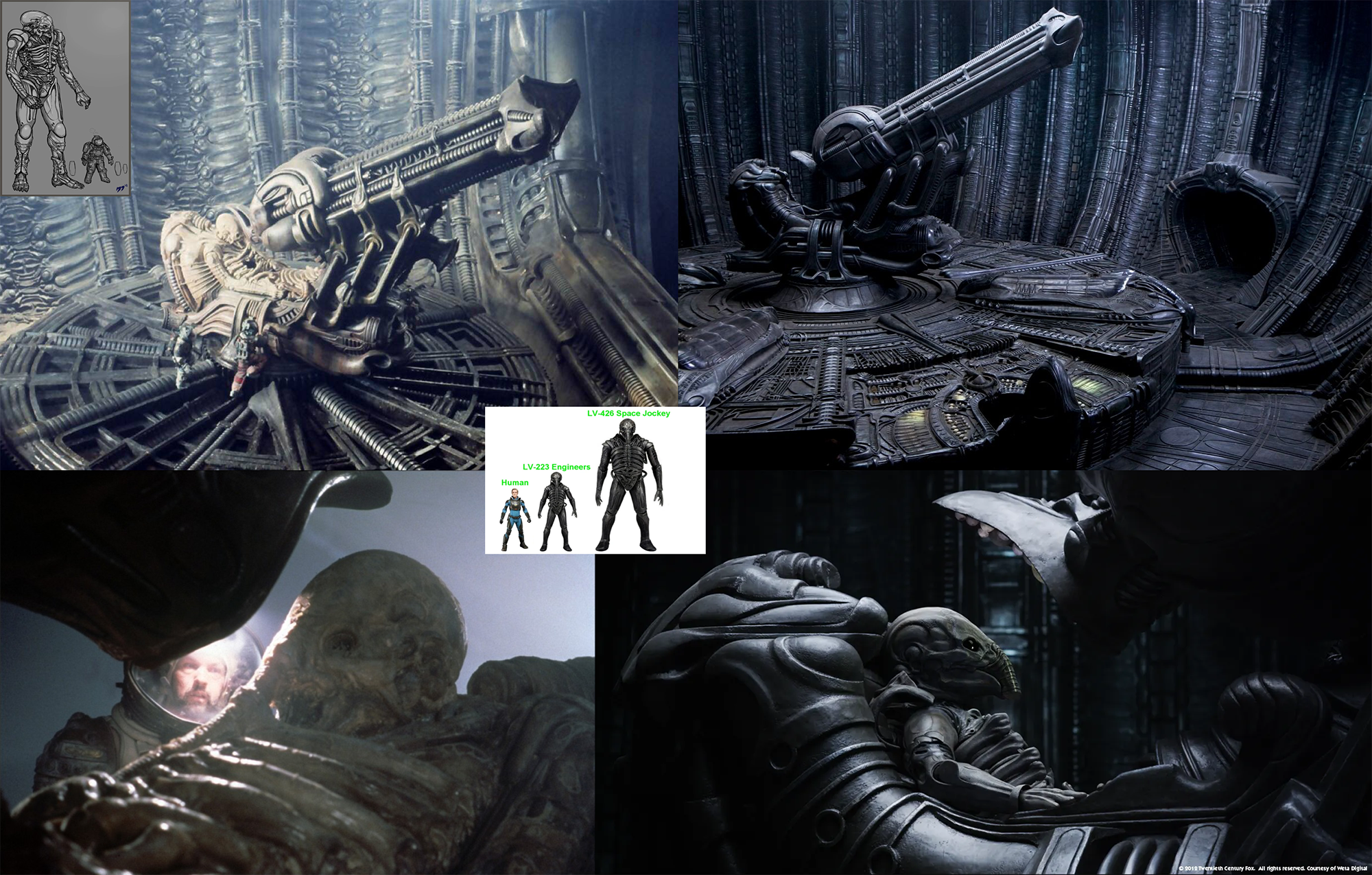 Now looking at the original terrestrial engineer stock in the opening shots, we may conclude these are different from the physically misshapen Engineer that slept in stasis on LV223. His physique looks alarmingly alien, with biomechanical ribcages and whatnot.