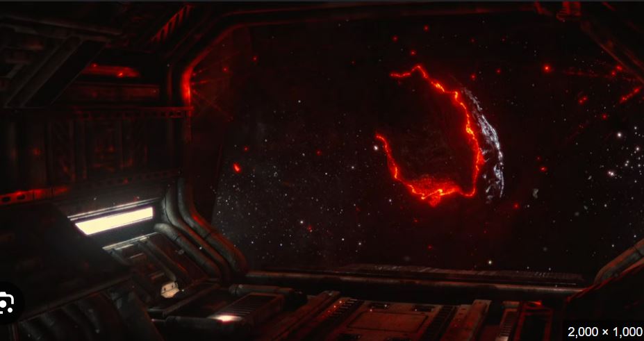 We see the Prometheus vessel streak across an unfathomable interstellar gulf of absolute nothingness to here. The distance is ‘about’ 350,047,027,485,489.6 kilometers. 350 quadrillion kilometers. Which is an absurd distance. Now I confirm that the vessel has four pretty powerful engines but even accelerating at 10 standard gravity the voyage can never take less than 37 years (the cosmic maximum speed). Hence the vessel uses some kind of FTL travel, which the weyland buff page has some statement on: